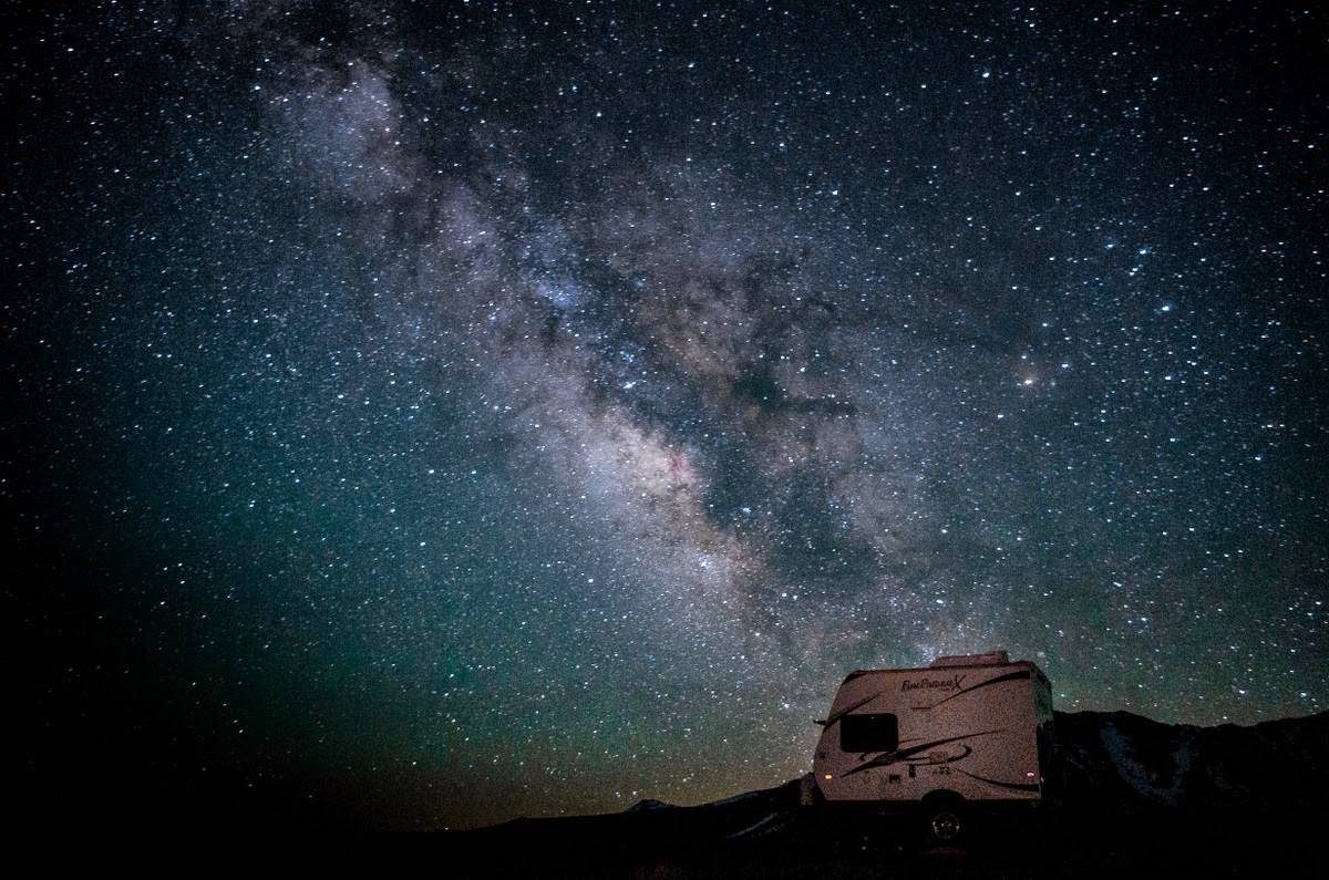 For folks who are trying to take star shots of your boondocking RV, let me pass along another editing tip I just picked up, courtesy of Camperfamily. (The photo almost certainly has to be processed through editing software, such as Lightroom or Photoshop, as mentioned earlier in this thread.) Camperfamily's trick is this: instead of just cranking up the exposure (which is what I had been doing, and which resulted in some odd colors in the sky), selectively crank DOWN the intensity of the colors, which gives a more natural "dark sky" look to the photo.