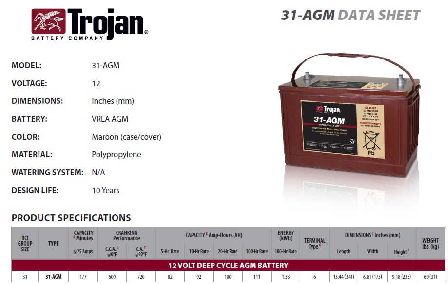 You can compare that to a TROJAN 31-AGM which weighs around 69LBS... TROJAN lists all their specs for all to see... Then you can get a better idea what to expect performance wise... i.e This battery will produce 12VDC@25AMPS for 177 minutes (2.95 hours). Six of these in parallel will produce 12VDC 12VDC@25AMPS for 17.7 hours... That might keep you going until the HIGH SUN comes out again to re-charge them again. Also re-charging any deep cycle battery that has been depleted down to the 50% charge state will want to see around 14.4VDC @ 17-20AMPS of DC Charge per battery in the bank if you want them to get re-charged in a short three hour time frame. In your case the initial DC charge demand for the six batteries in parallel will be in the neighborhood of 120AMPS DC Current. With a typical 120WATT solar panel only producing around 6AMPS DC CURRENT when in HIGH SUN you are a very long way from getting there if you want the batteries to get re-charged to at least 90% charge state in a three hour window.