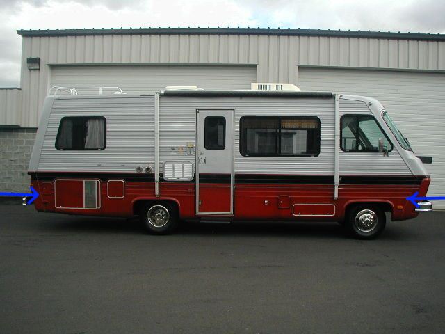 In this pic I added a pair of blue arrows, one on each end. Those arrows indicate the floor line, and where Fleetwood split the wall siding with the siding below the floor and as a cover for their storage boxes.