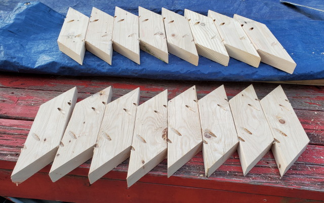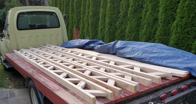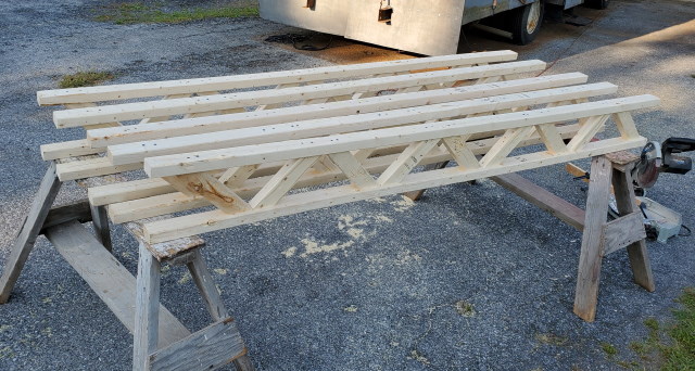 - Here's what I did today. Cut the pieces and assembled 4, yes, 4, trusses, that are 16 feet long. 2 of those on one side, covered with plywood, and the other 2 on the opposite side.