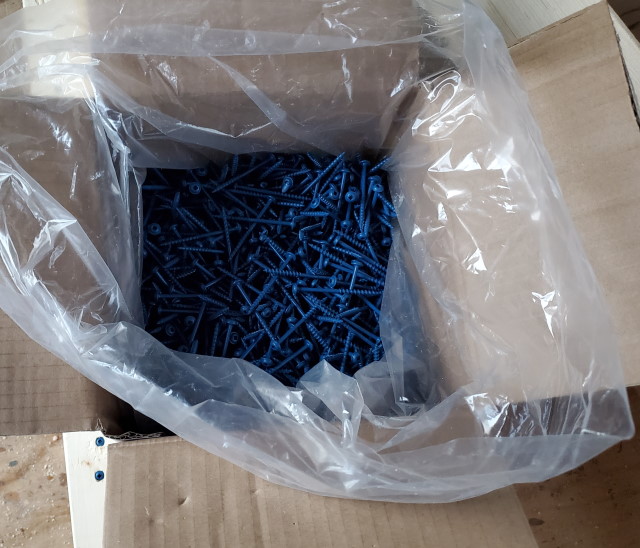 All 2000 of them. 2-1/2 inch, and coated for use outside. Another situation of much cheaper buying this amount than trying to buy smaller amounts. These were about $80, and for that amount of money, locally, I could get just a touch over 600 screws. - I built another 5 of these today using 2 x 3's that are 8' long. Adding that to the first one I built, and I now have 6 which will yield 3 platforms to walk on.