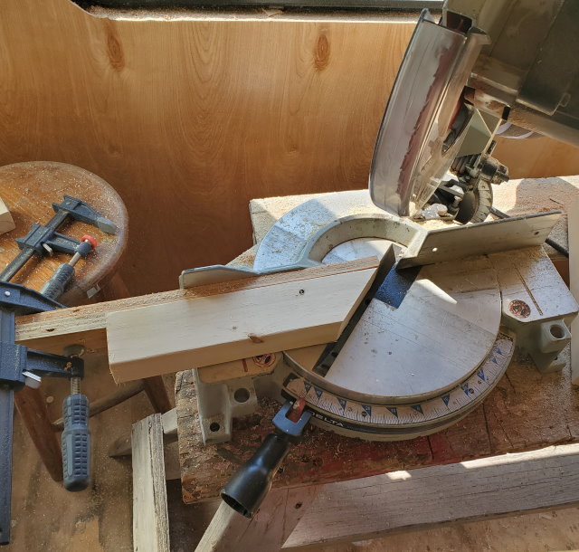 This is not assembled according to industry standards, but after putting weight on it, I am satisfied, it will do what I need it to do, for a short period of time. - I had a few 2" x 3" x 8' pieces of lumber that I had not used yet, so I decided to cut one of them into pieces, and on a 45 degree angle.