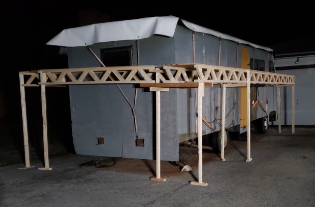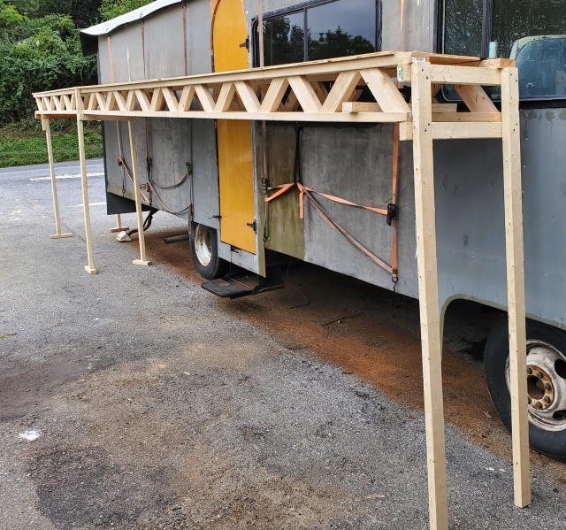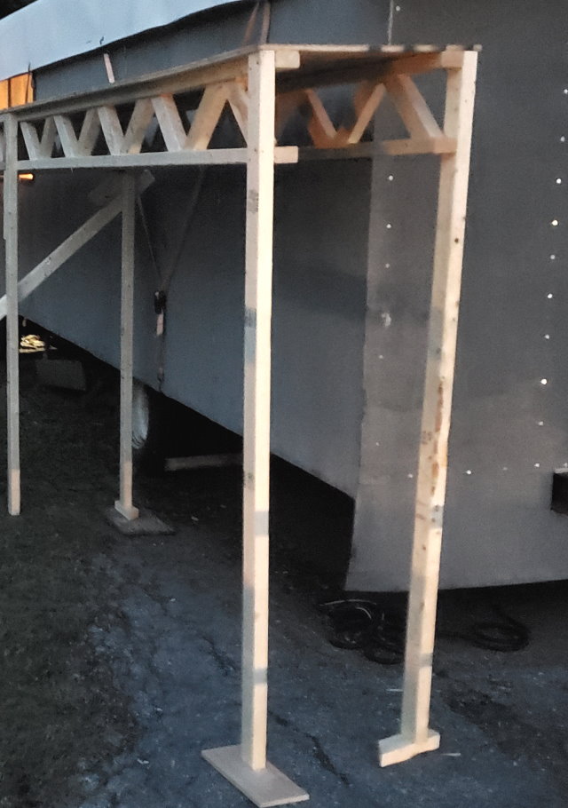 - Finally I screwed the plywood to the top of the 16 foot long truss. That means I now have 24 feet of truss on the drivers side. I still need to add some additional bracing on the legs, but overall it's pretty stable already.