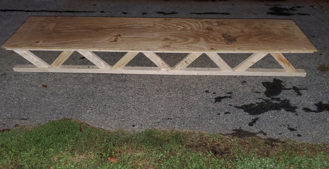- Another wonderful rainy day, off and on today. I did finally manage to put a piece of plywood on top of a pair of my trusses and the platform is a very nice stable piece, just like I wanted.