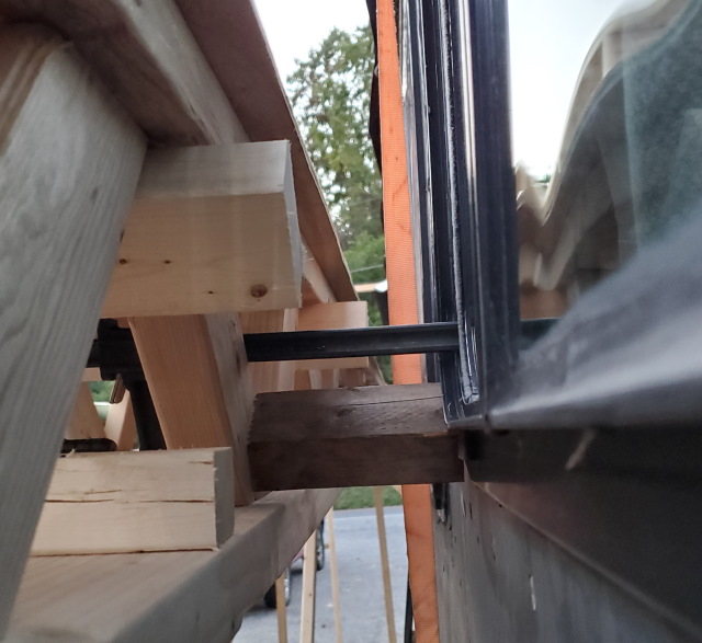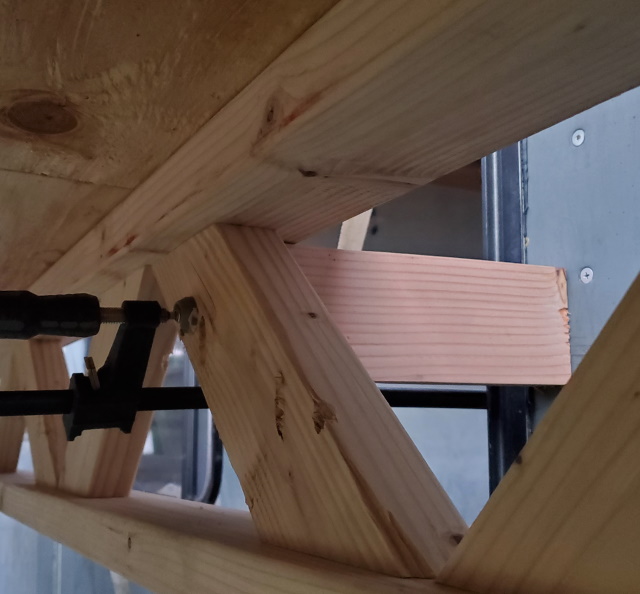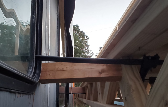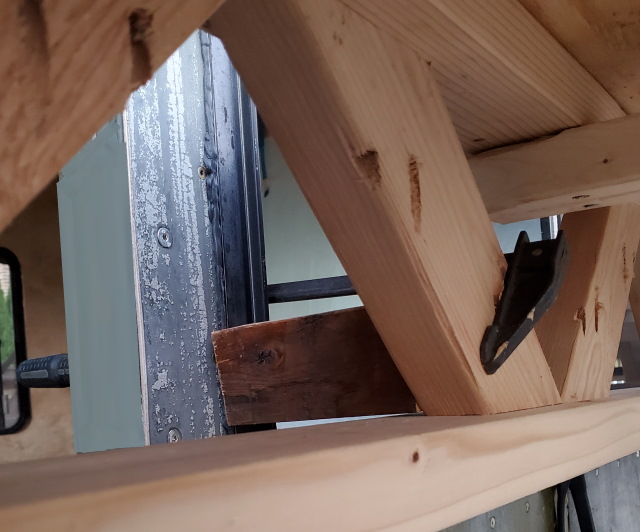 - On the passenger side, at the co-pilot's window is the same setup, with a 2 x 3 screwed to the scaffold, and clamped to the wall.