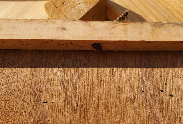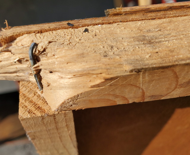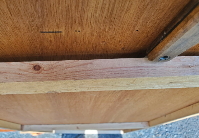 - This is one of the cross pieces that is 3/4" x 1.5". There are no staples, nails, screws, or adhesive holding the thin plywood to the cross piece. The plywood was staples around the outside edges only.