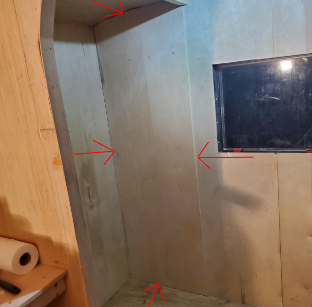 - Finally added a piece of 1/2" thick (sort of), plywood up against the back wall. It is glued and screwed in place.