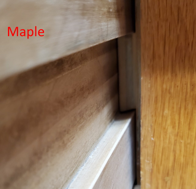 The left side is labeled, "Maple". That is the side of the drawer with a tapered groove cut into it.