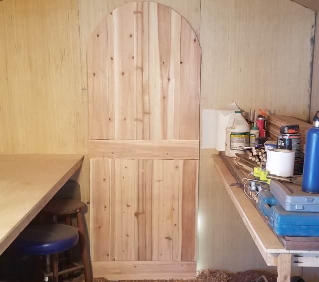 - Here is the opposite side of the bath door, after I glued a piece of 1/8" plywood over the cedar boards. That extra ply on the opposite side really stiffened up the door overall.