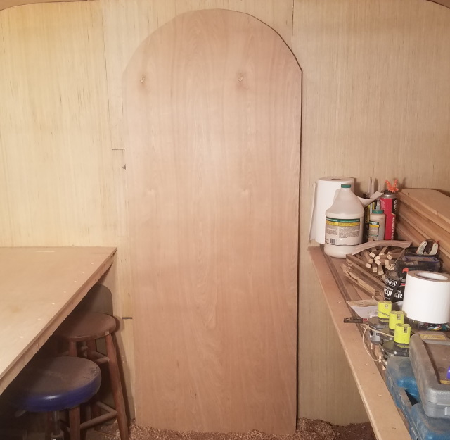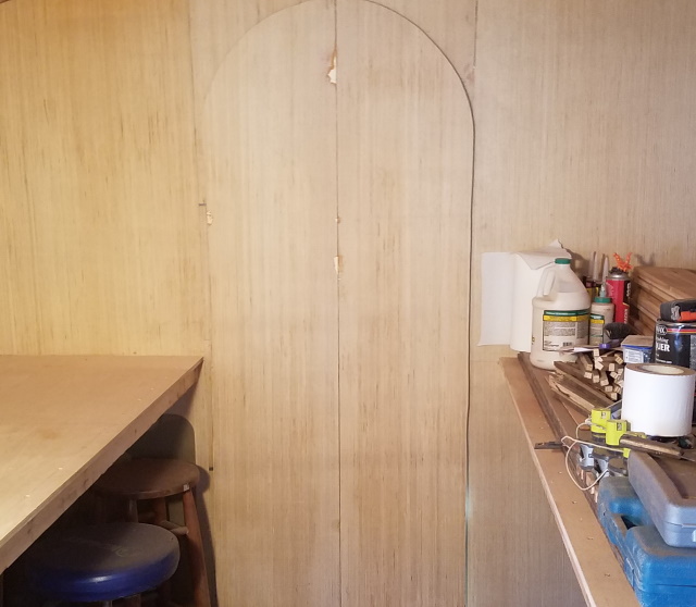 - By the way, before I glued the other side of the bath door, I sat the piece up against wall, and took a picture to see how it would look. Here is the plywood side.