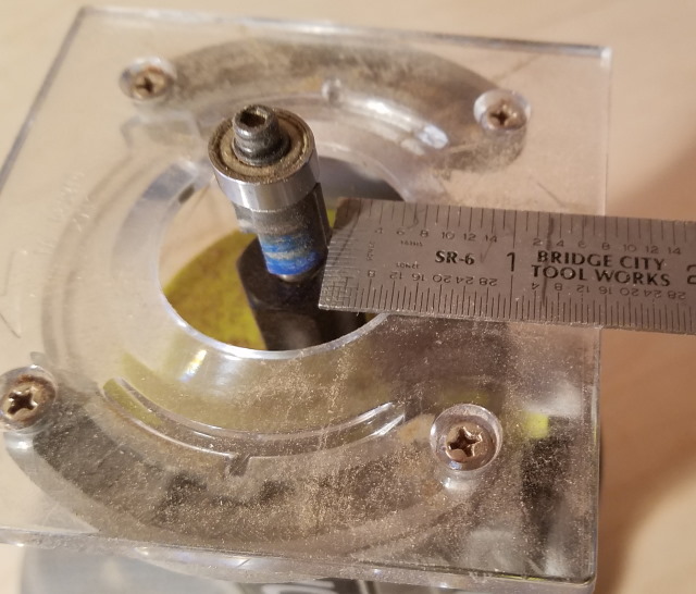 - First step was to measure the distance between the side of the router bit, and the edge of the router base. We have 1.5 inches.