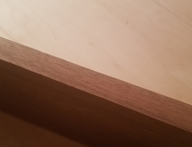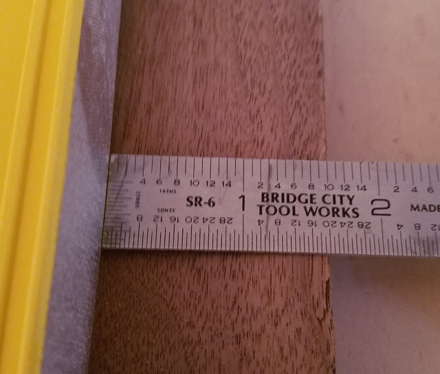 - Next was to set the distance between the level, and the edge of the black walnut board. I set this to an additional 1/8" at the most narrow area along the edge.