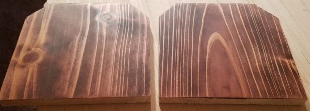 As you can see here, the stain did not absorb any way close to evenly, which was expected. I used a paper towel to apply the stain, and a few pieces of the paper town stuck to the rough areas of the board.