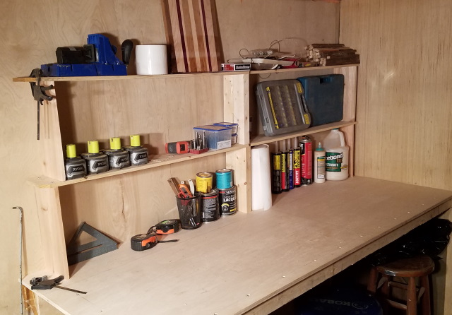 - While finishing up some clean up/reorganizing today, I decided to slap together a set of shelves, that would simulate something near to what I want to install at the rear of the one counters, eventually. (Yes, "slap together" is a technical term, similar to, "hand me the thing-a-ma-jig", when you want something handed to you).