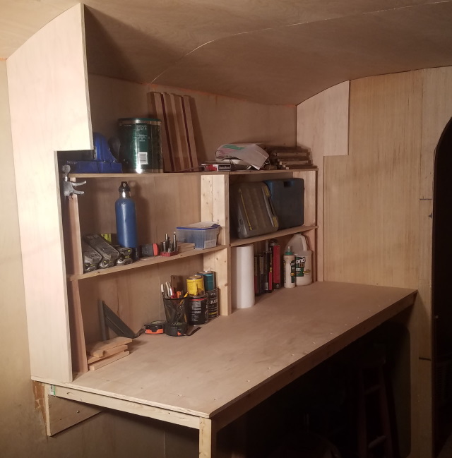 Here's a pair of shelf and cabinet ends for the passenger side. The curved portion at the ceiling was a bit of a trip to get it close to being right.