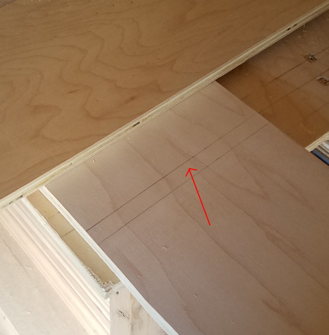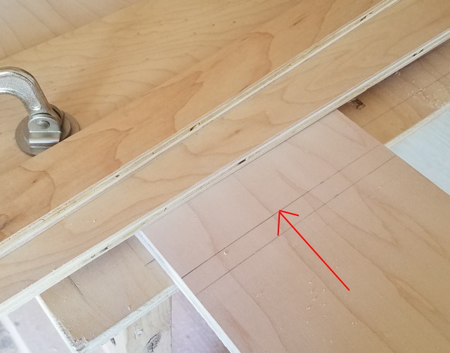 - Next was to mark where the dado was going to be in the end panels. I wanted the exact location of where the shelf would be, shown here at the end of the red arrow.
