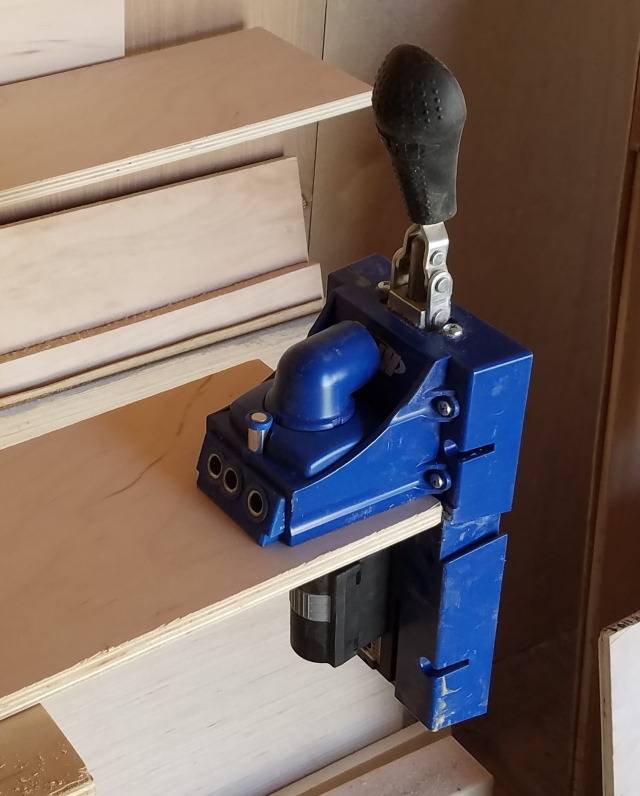 - After cutting the shelves, it's time to drill some holes for the Kreg screws. Since the shelves are longer than the distance I have between the counter and the ceiling, I decided just to use the Kreg jig in a vertical position, instead of horizontal. Works just as well.