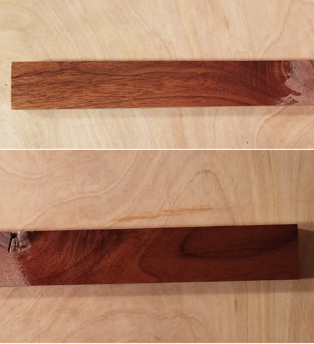 The bottom part was darker to start with, and you can see that on the upper portion towards the right. This is actually the same board, with a section in the center about 2" with no coating.