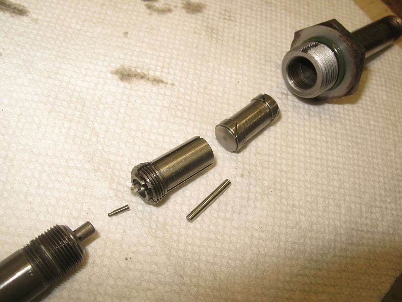 Note the TINY valve in the left of the picture. That fits inside the protrusion on the threaded part on the left. Also, the "pin" that is below the part in the center with the threaded end, fits inside that part. It was also "sticky" when I took it apart and after cleaning would literally fall through the threaded part.