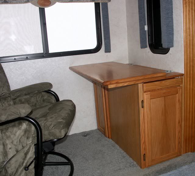 Along the middle of the RV on the deribver side was a table about 10'long or so that just stuck out under some windows.