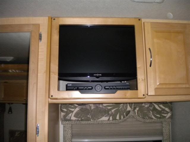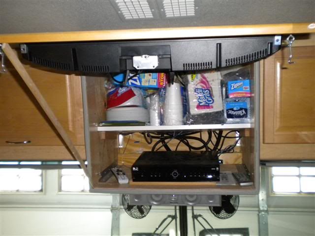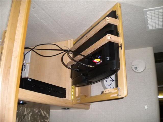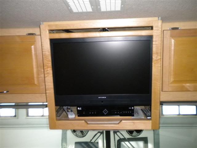No hinge on the front. I did consider it though. I have to plead the 5th on what might be stored behind the TV that is accessible. - TrackrigExplorer IIIt looks like JumboJets TV modification was in a 2004 Discovery, maybe a 39S model? Did you put the front TV on a hinge so you could use all of the space behind it like the rear TV?