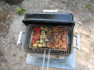 Here is a pic of the grillin' rig we carry. Webber grill, folding legs for compact storage. Grill basket with the long handle. This is a little cumbersume for tight packing but worth the space it needs. In this pic it is holding turkey kielbasa, fresh gulf shrimp sprinkled with Old Bay seasoning, zukinni slices and red pepper wedges. We completed the meal with Bush's Grillin' beans over microwave brown rice. Now, pass the hot sauce!!!! YUM!