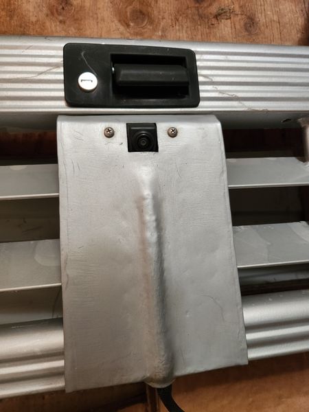I bolted the top of the sheet metal to the face of the camera and screwed the bottom of the sheet metal to the bottom of the tailgate.