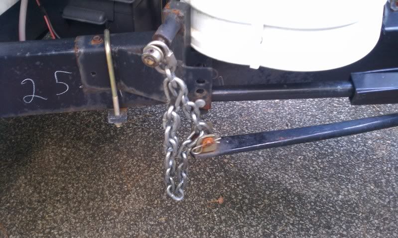 So how to get home on a Sunday afternoon? The screw jack was useless, so I removed it. I remembered last week cleaning out the storage compartment in the back of the Burb and I saw a length of chain…was going to put it back in the garage but figured I would leave it in the truck. The spring link that I had with the chin wouldn’t hold any weight, but I remembered I had a threaded link in my onboard HA parts kit. I got the bottle jack that I use for changing tires out of the TT and put it under the spring bar. I jacked up the spring bar to where it needed to go and attached the chain using the pin from the screw jack. Drove home without incident, truck handled great.