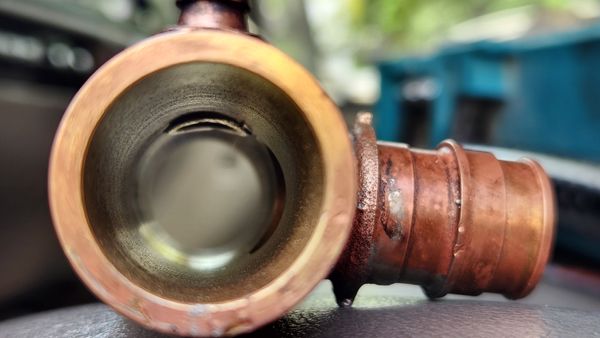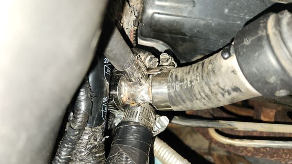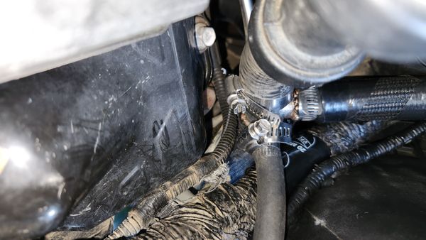Let's review the progress on cooling. When I first got the truck, it had reached 224 degrees and blown out significant coolant. Lets fast forward to now, it hasn't gone over 202 to 204 degrees and discharges very little coolant in worst case scenarios like a long steep grade in cruise control trying to maintain 65 mph. If I take it out of cruise, keep an eye on temp, turn on the fan lockup switch if it climbs over 195, I have no problem. With the electric fan installed, it is maintaining temperature even better, and with this coolant system modification, you can see the coolant level being pulled down in the degas bottle, as the waterpump is pulling coolant out of the degas bottle which keeps degas pressure lower. I'm pretty sure the two coolers atop the engine are doing their intended job condensing steam and cooling what goes into the degas bottle. My heat gun measures a 20 to 24 degrees drop in temperature from input to output. The volume of coolant passing through these coolers is insignificant to the engine, but to the degas bottle it is a significant drop in temperature and judging by the amount of coolant purge declining, it's reducing pressure through condensation.