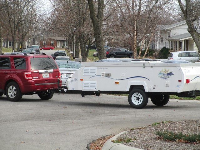 Our Sport weighs 2,000# fully loaded and we tow with a 1.8L four cylinder @ 22 MPG average over nearly 20,000 miles now. - sushidogExplorerI have an 06 Aliner LXE. I towed it with a 4 cyl car (a Chevy Cobalt) for over 40,000 miles. I now have a truck so I have retired my car from its towing duties as it now has 292,000 miles and the automatic tranny is acting up a little. I have a low walled model, but it's still so high at the peak inside that I can't reach the rook standing on my tiptoes - more headroom that anything else out there. When laying in my king bed next to the back ceiling panel there is still plenty of room. You just can't stand up in the bed by the sloping ceiling, but who would do that? In fact there is so much headroom that it never feels claustrophobic. Here's a pic of my DW and DDog on the bed:
