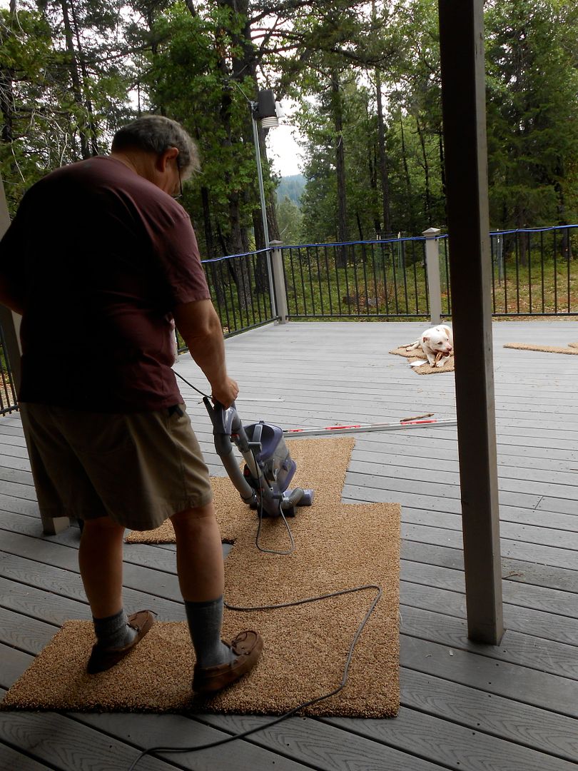 Next was to put down some tool drawer rubber anti-slip webbing. I had enough to cover most of the linoleum and then install the carpet, which is now removable for subsequent beating or vacuuming. As I get older i don't want ANYTHING near the stairs to slide or slip.