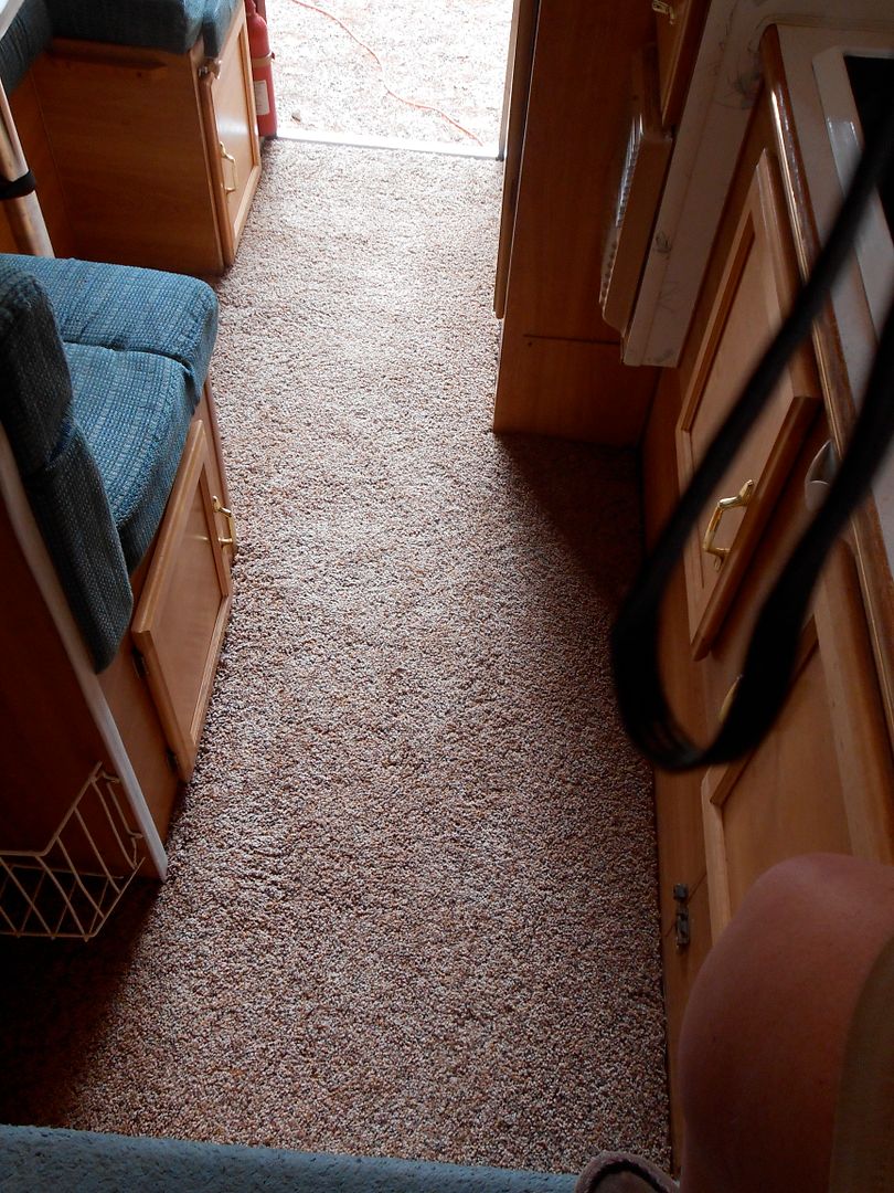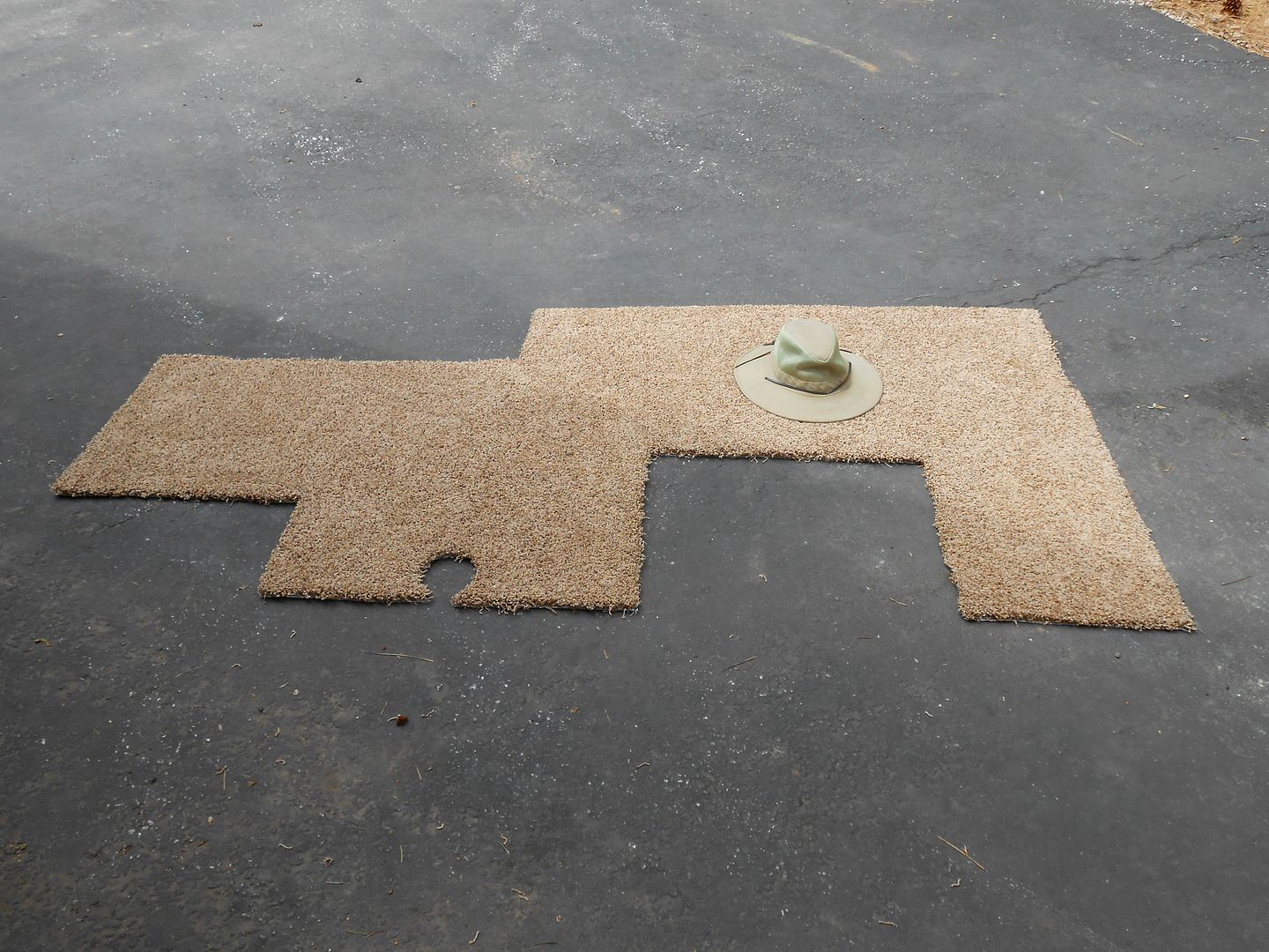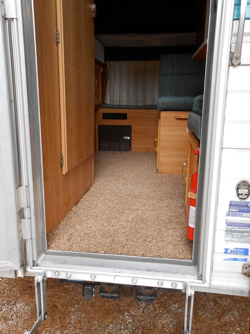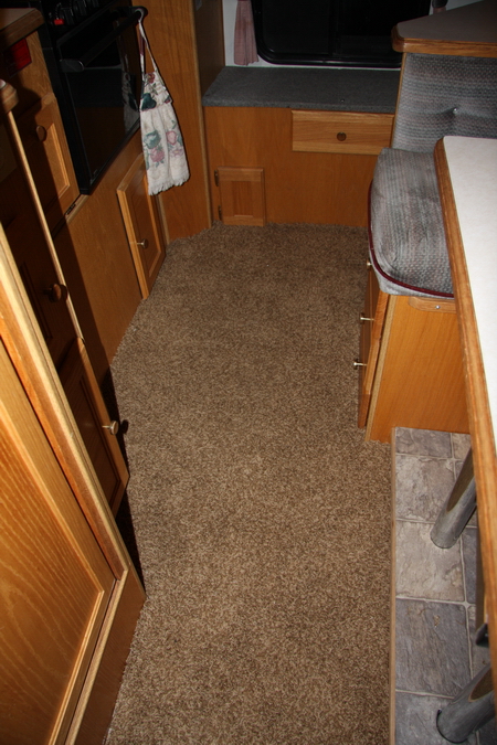 No, this is not WWII, nor Bomber Harris, but it is the tale of two carpets. We remodeled our bedroom including a high bucks, medium pile carpet, and because of all the red dirt around here, and we're in the 'can't-lick-'em-join-'em' school, settled on what I call a Kaibab Brown having traipsed thru the stuff all over the southwest. It's really an Adobe brown with a red tint. Kind of, Kaibab Kamoflage. Just remember, if you can't see it, it's not there. We had a small piece about 4 feet by 7 feet long left over with which I promptly adorned our rear deck entryway. It has made it thru the winter with no dilapidation. Every time I walked out on the deck to obtain more firewood, I walked over it and said to self, "This is nice, but what a waste." Hmm. The old creaky gears started to turn. Our linoleum floor in the TC is getting a little tired, and It's no fun to drop out of the sack on a 10 degree morning to turn on the heater. I said to Jeanie, " What about carpeting the TC with the leftover?" She said O.K., and I immediately set out to make a floor plan of the TC.