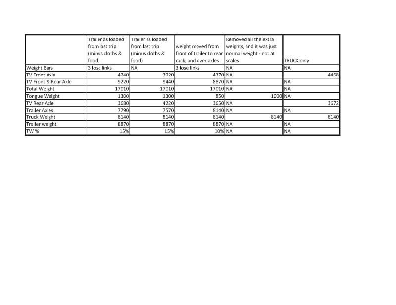 I plan on weighing the front axle, the loaded truck (still hooked up), the whole rig, just the trailer, and then I want to unload the weights in the front bedroom floor and get a weight of the trailer in traveling form without water. We’ll see if the scale house will play.