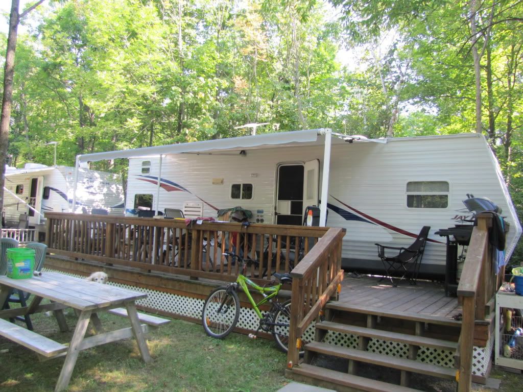 • Most seasonals that I see leave the slides open May to Oct. just don't use slide supports. When we were seasonal we always left the electric on, don't want to empty the fridge every week. Also leave the propane as said earlier so you have the backup for the fridge. Either tie down or close the awning, depending on what you have under it and if stuff can get wet. Hot water off and water off. Enjoy.