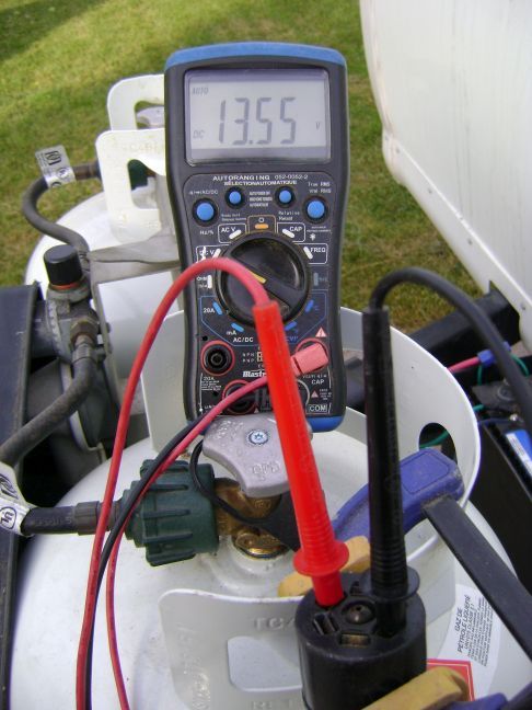 first picture is a simple battery voltage test at the 7 pin. black lead from the meter in the bottom right slot(ground), red lead in the top left(12v from tv). my reading is 13.55, normal considering I had just unplugged the trailer from the house