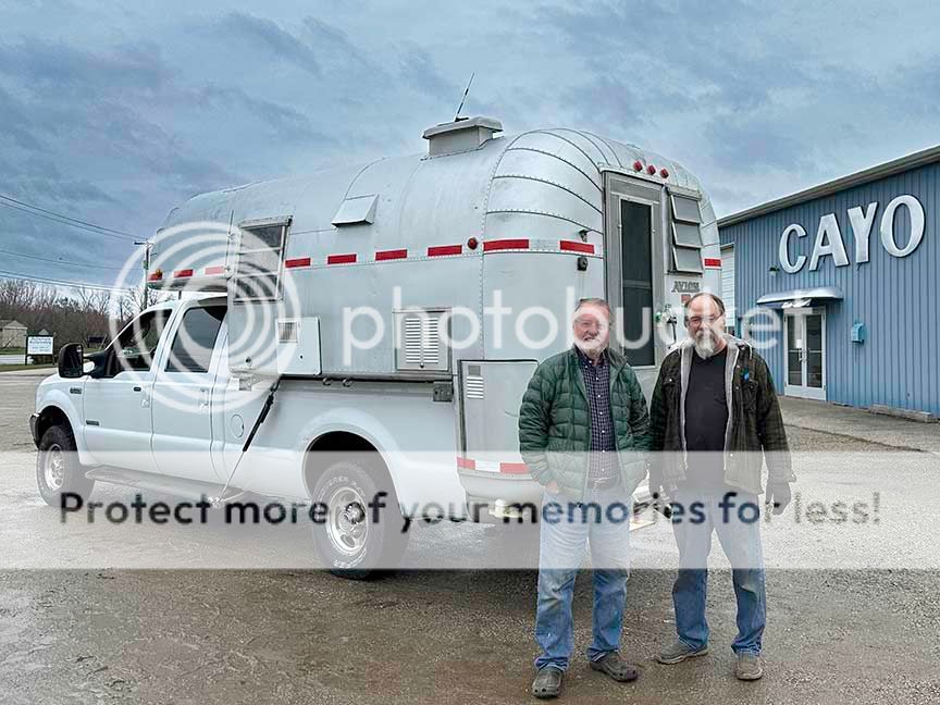 Me and Chuck Cayo at the Cayo facility in Watervliet, Michigan on a late winter day. I got my Avion back. On the trip south I stopped several times for diesel, etc and as Cajunavion says, I had press conferences at the pump, inside the convenience store and once in the restroom. People love to talk about the Airstream on the back of a truck.